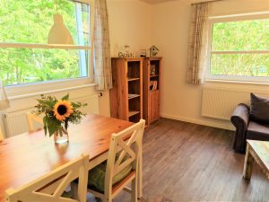 Maritime Atmosphäre, Blick in den Garten. Doppelbett 180×200 cm, Schlafsofa, Geschirrspüler.